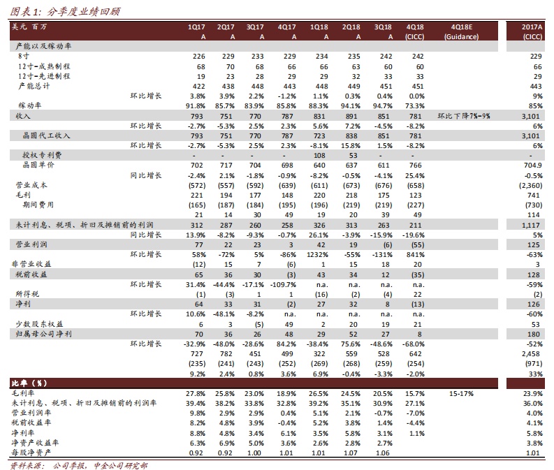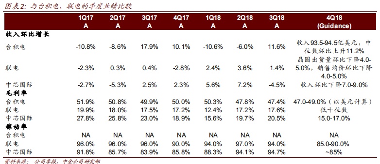 中芯国际 2018 年三季度业绩符合预期。公司收入环比下降 4.5%,毛利润率下降 3.9 个百分点(考虑技术授权收入的影响)。剔除技术授权收入的影响后,公司收入环比增长 1.5%,毛利润率环比小幅上升 0.8 个百分点,主要得益于三季度产能利用率有所提升。