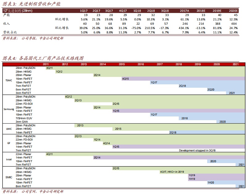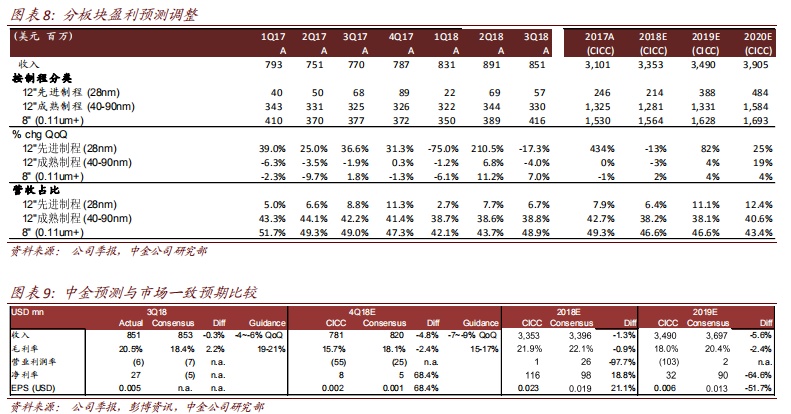 2018 年三季度,公司 28nm 板块收入环比下降 17.3%。公司的 28nm HKC+平台研发已经完成,有望从 2019 年起进入量产阶段。公司继续努力构建全面的产品组合,为未来进一步扩大客户群打下基础。公司预计未来 HKC+的大部分订单将主要来自于 HKC平台的转单。考虑到当前行业内严重供给过剩,公司对产能扩张持谨慎态度。因此,预计 2019 年 28nm板块的销售贡献占比将维持在高个位数。