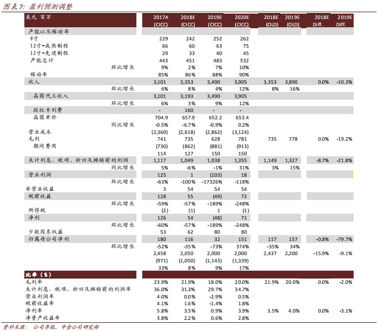 公司将 2018 年代工厂资本支出计划从 23 亿美元下调至 20 亿美元,主要由于设备搬入计划带来的成本节省。我们预计公司 2018 年和 2019 年折旧摊销费用分别为 10.50 亿美元和 11.43 亿美元。剔除技术授权收入影响后,预计公司 2018 年毛利率有望维持在高十位数。