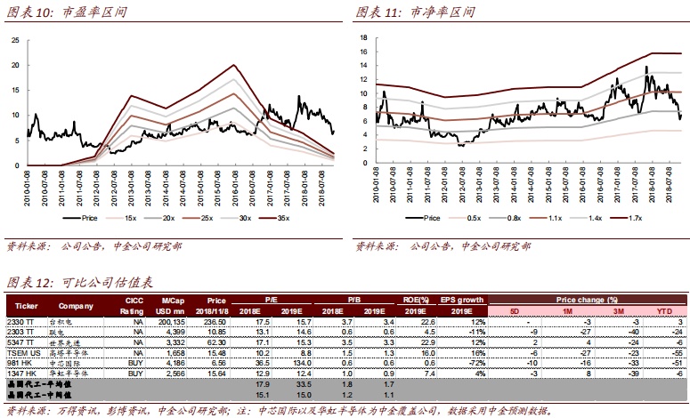 盈利预测 我们将公司 2019 年资本支出预测下调 9.1%,维持公司 2020 年资本支出预测不变。同时,我们将公司 2019 年和 2020 年月产能预测分别下调 8.5%和 16.0%。我们预计公司可能会放缓北京合资工厂(B2)的产能扩张,以避免进一步加剧 28nm 工艺产品供给过剩。我们将公司 2018/2019 年净利润预测分别下调 0.8%和 79.7%, 以反映公司研发费用和折旧摊销费用上升以及行业增速放缓所带来的影响。考虑到需求相对疲弱,我们预计 2019 年对于中芯国际将是艰难的一年。