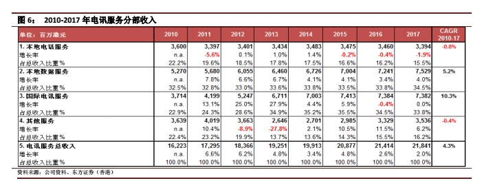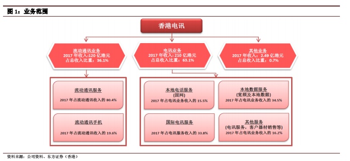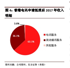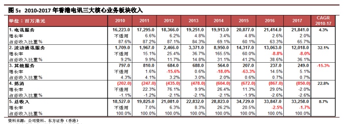 香港电讯三大商业分部包括电讯服务、流动通讯服务及其他服务。抵消仅适用于电讯服务分部内部销售收入。电讯业务分部为香港电讯收入贡献最大的板块。其在2010年至2017年取得稳定增幅,年均复合增长率达4.3%。2014年香港电讯重新收购CSL,受此影响,其2014年及2015年流动通讯业务收入分别增长165.5%及 60%。