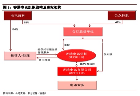 电讯盈科在经历分拆上市后,其仍为香港电讯的主要股东,持股比例达52%。香港电讯管理有限公司(托管人-经理)为电讯盈科的全资附属公司。后电讯盈科分拆电讯业务以商业信托形式上市。
