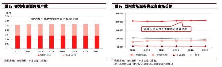 香港电讯为本地固网市场领导者。尽管香港开放了其固网市场,但香港电讯仍在2010年至2017年间以逾60%的市场份额占据固网市场领导者的地位。香港电讯在用户管理上经营有方,其在家居固网服务中引入eye多媒体产品,在商业固网服务中引入 One Communications综合通讯服务项目。2010年至2017年,香港电讯固网用户数保持稳定,维持在约260万人。