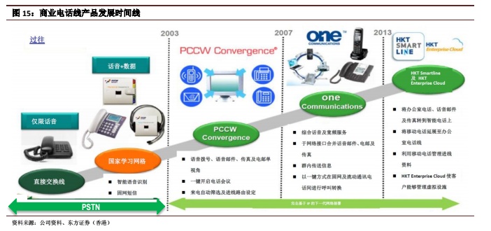 在商业固网业务板块,香港电讯不断拓展推出各类不同产品。2003年, 公司首次推出PCCW Convergence。公司最新产品包括HKT Smartline及HKT Enterprise Cloud,其所推出的时间为2013年。