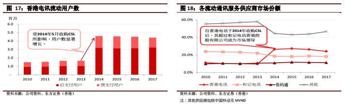 重新收购 CSL 对香港电讯产生积极影响。是次收购使流动通讯用户数大幅提升177.2%,从 2013 年的 170 万人升至 2014 年的 460 万人。香港流动通讯市场竞争积累,此次重新收购 CSL 也使香港电讯成为该市场排名第一的流动通讯服务供应商。香港电讯以其高渗透率于 2014 年赶超和记电讯香港控股有限公司。其在流动通讯市场的市场份额从 2013 年的 9.6%升至 2014 年的 26.4%,并于2017 年达到 24.0%。