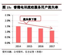香港电讯每名客户平均消费额正处于上升趋势。其从 2010 年的 141 港元升至2017 年的232 港元,而顾客流失率则从2014 年的1.5%降至2017 年的1.1%。