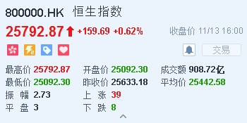 智通财经APP获悉,恒指早盘低开540点,报25092.3点。截至收盘,恒生指数涨159.69点或0.62%,报25792.87点,全日成交额达908.72亿。国企指数涨0.37%,报10478.71点,红筹指数涨0.62%,报4232.14点。