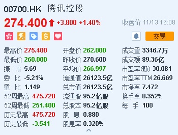 蓝筹股方面,腾讯(00700)今日低开高走,午后反涨,并将于明天(11月14日)公布三季度业绩,截至收盘,涨1.4%,报274.4港元,大市盘前成交额为89.36亿港元,指数贡献31点。