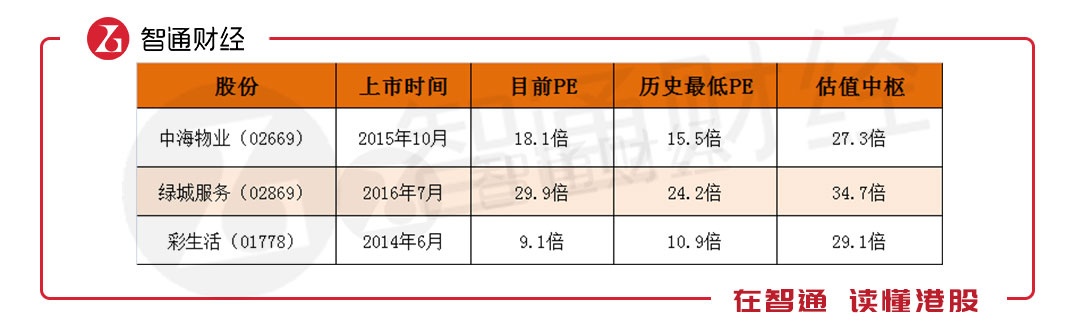 从历史估值来看,智通财经APP通过梳理上市超过2年的物业上市公司发现,不管是中海物业、还是绿城服务,目前估值都已接近历史估值低位。