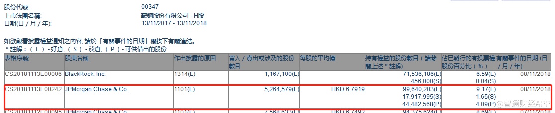 智通财经APP获悉,根据联交所资料显示,摩根大通于11月8日增持鞍钢股份(00347)526万股,每股作价6.79港元,总值约3571.5万港元,最新持股量增至9.17%。