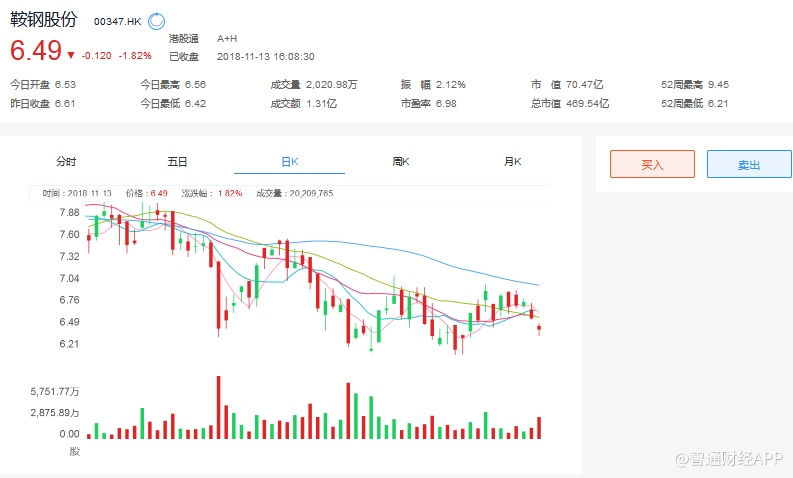 截至今日收盘,鞍钢股份(00347)报6.49港元,跌1.82%。