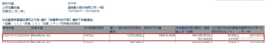 智通财经APP获悉,根据联交所资料显示,贝莱德于11月8日增持潍柴动力(02338)151万股,每股作价8.34港元,总值约1259.3万港元,最新持股量增至10.00%。