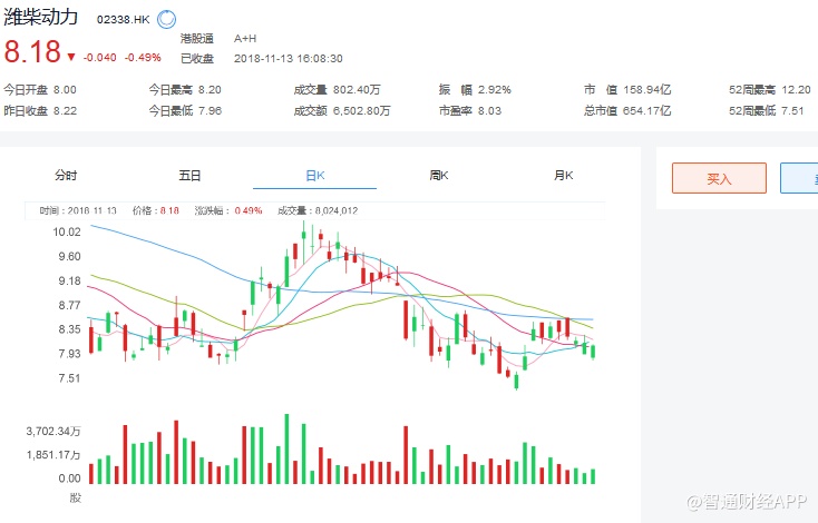 截至今日收盘,潍柴动力(02338)报8.18港元,跌0.49%。