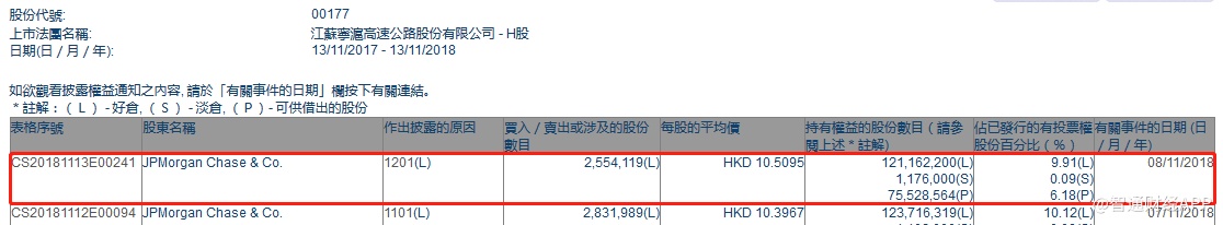 智通财经APP获悉,根据联交所资料显示,摩根大通于11月8日减持江苏宁沪高速公路(00177)225万股,每股作价10.5港元,总值约2362.5万港元,最新持股量减至9.91%。
