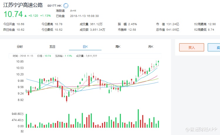 截至今日收盘,江苏宁沪高速公路(00177)报10.74港元,涨1.13%。