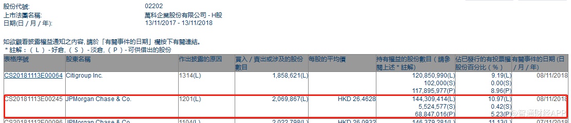 智通财经APP获悉,根据联交所资料显示,摩根大通于11月8日减持万科企业(02202)206万股,每股作价约26.46港元,总值约5450.8万港元,最新持股量减至10.97%。