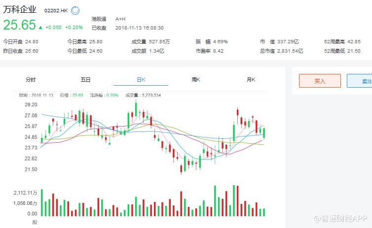 截至今日收盘,万科企业(02202)报25.65港元,涨0.20%。