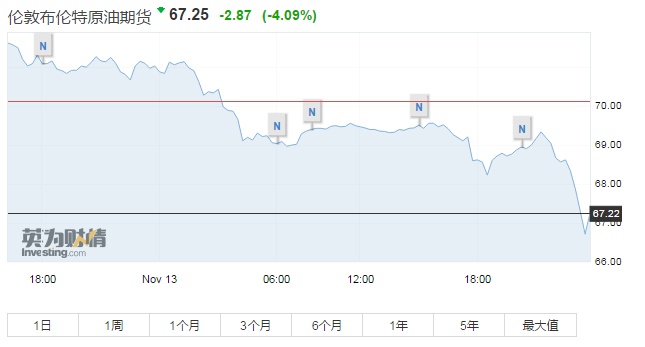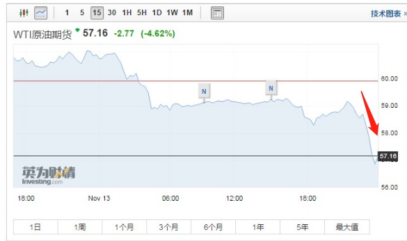 智通财经APP获悉,北京时间11月13日晚间,美、布两油短线暴跌。WTI原油跌破57美元关口,跌幅近5%。布油跌破67美元关口,跌近4.5%。