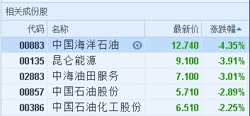 智通财经APP获悉,国际原油价格大跳水,港股石油股早盘股价遭重创,截至9时20分,中海油(00883)跌4.35%,报价12.74港元,昆仑能源(00135)跌3.91%,报9.1港元,中石油(00857)跌2.89%,中石化(00386)跌2.25%。