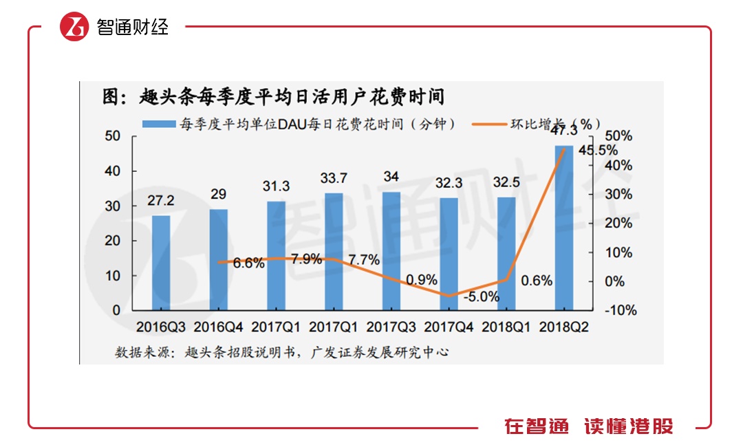 反正上市有钱了,在甩开膀子砸钱后,不仅DAU增长了,其他方面也有所改善。最为明显的,莫过于季度平均日活用户花费时间。从2017年以来,趣头条每个季度的平均DAU花费时间在31—34分钟之间,但到了2018年第二季度,单位DAU所花时间直接增长45.5%至47.3分钟。第三季度时,单位DAU所花时间再度提升,达到55.9分钟,同比增加18.9%,这都是趣头条加大打赏力度所营造的“繁荣”场面。