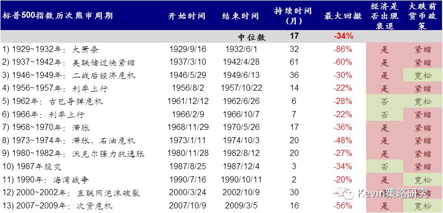 美股从1929年以来共有13次熊市,平均时长为17个月,平均回撤幅度为34%