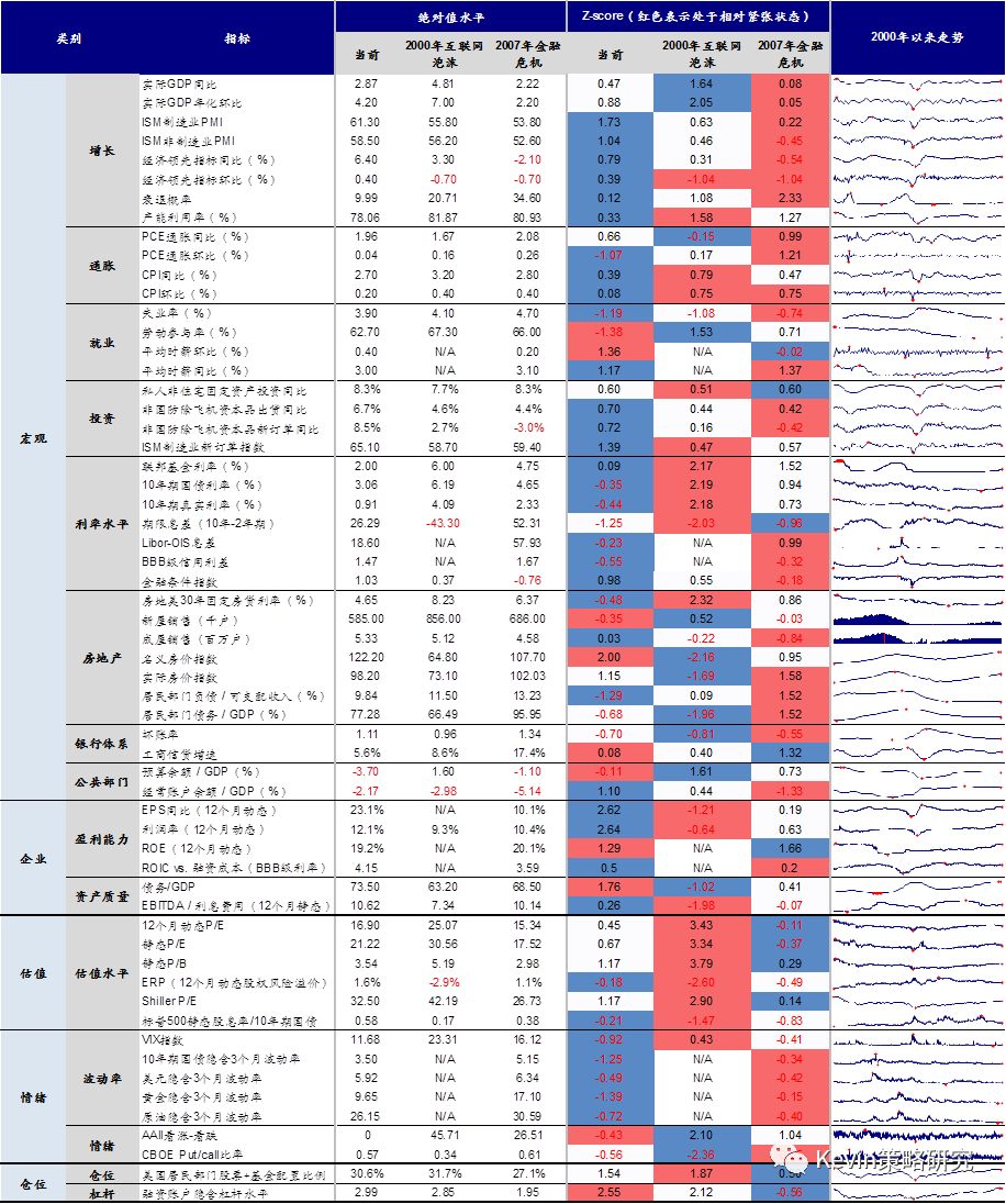 相比历次熊市拐点,当前市场环境并没有很极端。我们从宏观环境(增长、通胀、就业、利率环境、投资、房地产、公共部门、银行体系)、企业部门(盈利能力、资产质量)、估值水平、市场情绪(波动率、投资者情绪)、仓位配置(居民部门配置比例、融资账户隐含杠杆)等五个大维度,15个细分类别、近60个指标来综合对比10月市场大跌前所处的位置与历史上熊市前拐点处的异同点。我们选取2000和2007年这两轮熊市拐点作为对照,因这两轮熊市阶段离我们最近、跌幅较深、且均为美股自身问题引起而非单纯外部环境扰动所致。