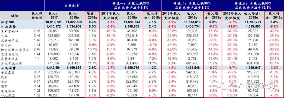 其次、居民金融资产缩水进而或对需求形成抑制、对企业收入造成负面影响。金融资产缩水可近似看作收入和收入预期的降低,在此背景下,居民的消费预期也会随之降低,进而直接影响企业收入。我们参考《经济学》(PaulA. Samuelson)中对不同类型消费品收入弹性的测算,为标普500指数消费板块设置收入弹性系数(需求的收入弹性=需求量变动的百分比/消费者收入变动的百分比),可选消费板块的收入弹性系数均大于1,而必选消费板块弹性则相对较低,多数低于1。当前标普500指数2018年收入增速预期为8.3%,可选消费和必选消费板块收入增速预期分别为8.5%和3.9%。粗略假设美股大跌造成居民部门金融资产减少的幅度直接对应居民部门收入降低的幅度,并参考上述收入弹性系数测算,在美股下跌20%、30%和50%三种情境下,标普500指数2018年收入增速将分别降至7.1%、6.5%和5.4%;消费板块2018年收入增速将分别降至1.8%、-0.4%和-4.9%(图表27)。