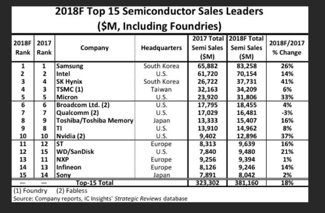 图|国际市调机构ICInsights针对2018年全球半导体厂排名(来源:Icinsights)
