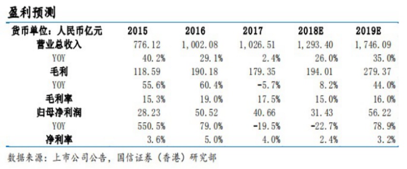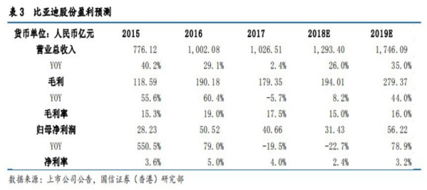 我们对公司 2018-2019 年的增长情况进行了预测。结合新能源车行业发展趋势,以及公司的新车型推出计划,我们预计公司最为核心的新能源车业务 2018-2019 年将继续充当增速最快的业务。在其带动下,公司总体收入水平有望延续快速增长,并且 2019 年有可能加速增长。我们预测公司 2018 年归母净利润为 31.43 亿元人民币,较去年将出现一定程度下滑。同时预测 2019 年公司归母净利润将出现高速增长(见表 3),主要理由在于公司汽车业务,尤其是的新能源车销量有可能迅速增长,从而带动公司盈利规模的快速扩大与盈利能力的明显提升。