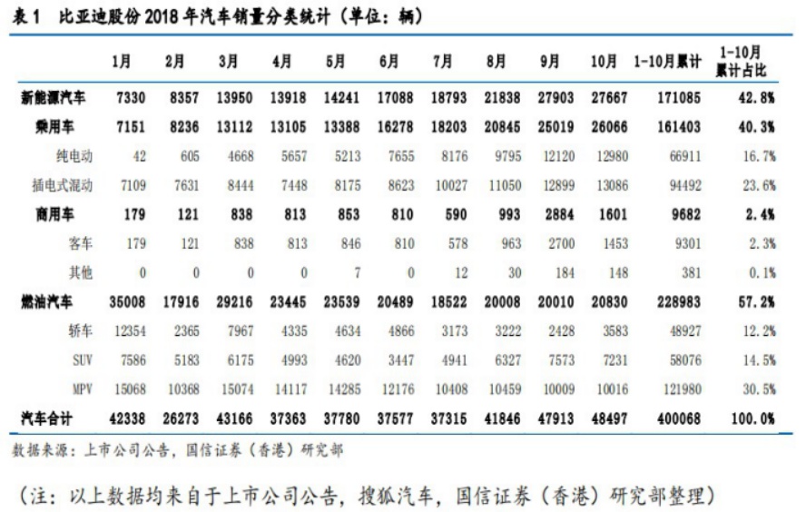 根据公司公告,2018 年 10 月比亚迪股份汽车销量录得 48497 辆,同比增长约 30%。其中,新能源车销量达