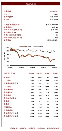我们维持 2018 年和 2019 年每股盈利预期 0.97 元和 1.10 元,对应同比增长 15%和 13%。公司当前股价对应 13 倍 2018 年市盈率和12 倍 2019 年市盈率。维持推荐评级和目标价 22.6 港元,对应 19倍 2019 年市盈率,较当前股价有 52%上行空间。