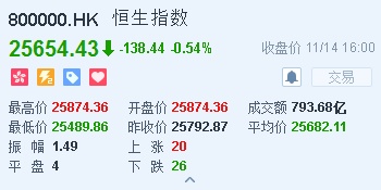 智通财经APP获悉,恒指开盘高开0.32%,报25874.36点。截至收盘,恒生指数跌138.44点或0.54%,报25654.43点,全日成交额达793.68亿。国企指数跌0.7%,报10405.16点,红筹指数跌0.38%,报4216.12点。