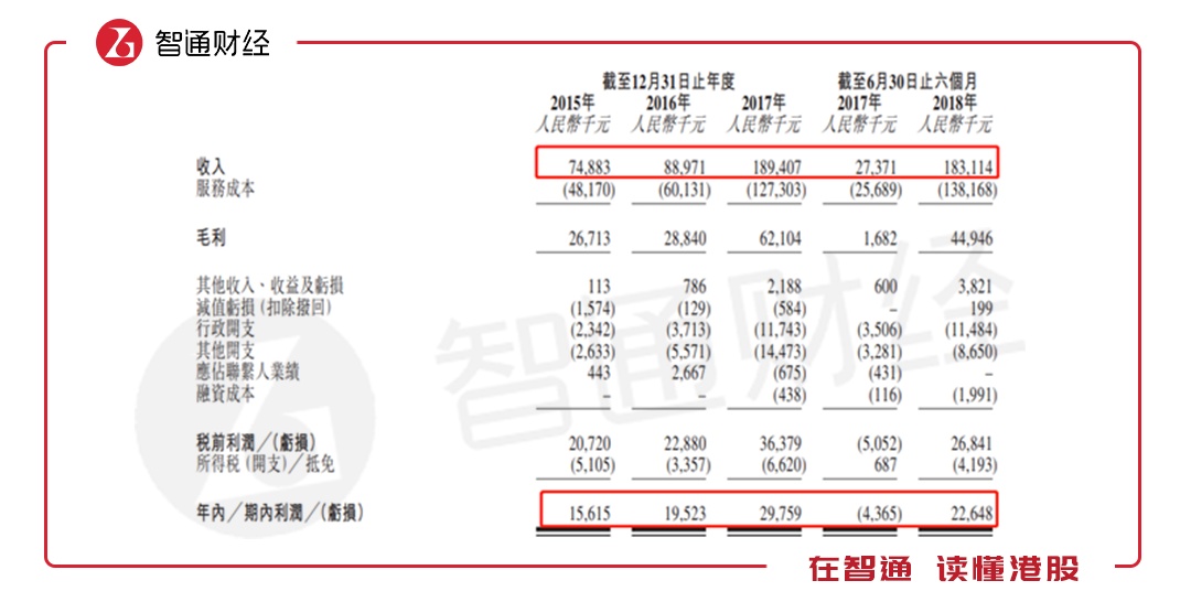 得益于项目和处理能力的持续增长,智通财经APP观察到,该公司收入从2015年的74.9百万元人民币(单位下同)增至2016年的89.0百万元,并进一步增至2017年的189.4百万元,年复合增长率达59%。年内净利润从2015年的15.6百万元增至2016年的19.5百万元,并进一步增至2017年的29.8百万元,年复合增长率达38.1%。并且2018年上年,录得收入183.1百万元,净利润为22.6百万元,半年时间基本达到了去年一年的水平。