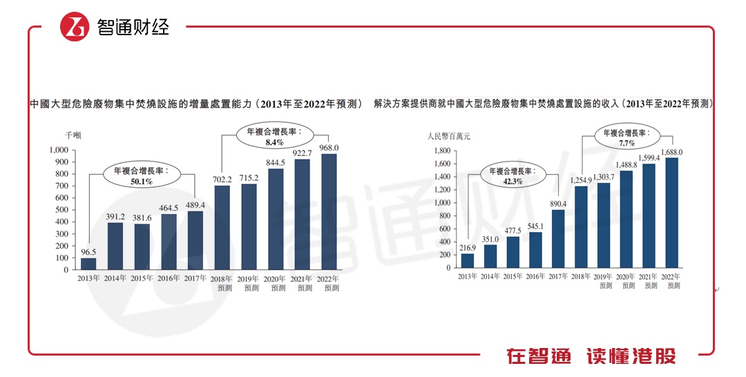 除却公司本身的因素,危废焚烧处置的市场前景也是比较明朗的。智通财经APP了解到,中国大型危废集中焚烧设施的增量处理能力预计从2018年的70.22万吨增至2022年的96.8万吨,年复合增长率为8.4%。按收入计,从2013年的217百万元增至2017年的890百万元,年复合增长率为42.3%,预计未来五年年复合增长率为7.7%,2022年达到1688百万元。