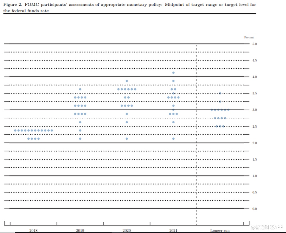 这是美联储最新的“点图”,其中勾勒出官员对加息可能路径的个人预测,并显示明年和2020年几次加息的中位数估计。