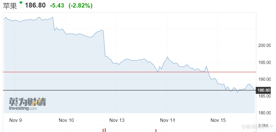 智通财经APP获悉,苹果公司(AAPL.US)股票周三遭古根海姆合伙公司分析师下调评级及iPhone销量预测,瑞银也于同一天下调iPhone销量预期和股票目标价。受此影响,苹果股价在美股市场周三的交易中收跌2.82%,报186.8美元,正式滑入熊市区域,与此前触及的历史高点相比已累跌20%以上,其市值更是一度跌破9000亿美元。