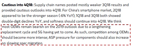 3Q18的业绩出来后,大家“惊喜“地发现原来2Q18才是今年手机产业链的业绩顶峰——同比增速-6%,因为前后两季度的负增长都达到了两位数,而展望四季度怕是也难以乐观,原因主要有以下四点: