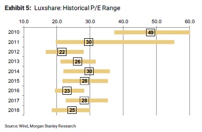 秋风萧瑟,手机产业链的难兄难弟们真的是“一夜回到解放前”,估值直接打回到前移动互联网时代:从2013-2017年的25-30倍远期PE,一路打到10-12倍。大摩在这里夸了坚挺在20倍之上的立讯,但这是骗不了我们的,要知道当年这货可是近50倍PE啊。