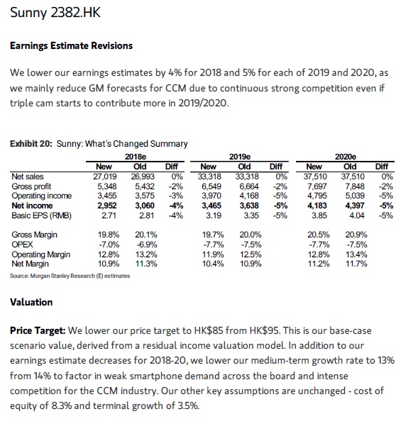 大摩给予舜宇光学科技(02382)“持有”评级(EW),在一片看衰之中已属不错,目标价(PT)85港元,主要的担忧其实也来自于汽车销量下滑对光学部件的潜在影响。