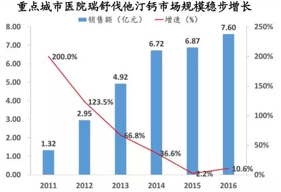 2016年瑞舒伐他汀钙在国内重点城市样本医院销售额达到7.6亿元人民币,增速10.6%,在降血脂类药物总销售中占比超过25%,仅次于早8年在国内上市的阿托伐他汀钙。瑞舒伐他汀钙在国内销售规模在2015年前呈爆发式增长,2015年受瑞舒伐他汀钙核心化合物专利期临近引发的进口药降价影响,增速放缓,但2016年又显著回升。