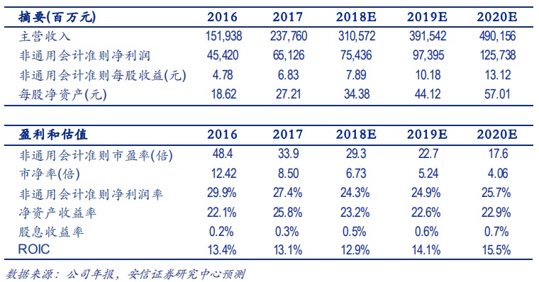 我们预计 2018/19 年的非通用会计准则净利润分别为 754 亿元和 974 亿元,对应净利润同比增速分别是 16%和 29%,非通用会计准则净利率将在 254%-25%的水平。我们根据三季度业绩调整全年的盈利预测,将 2018/19 的 non-GAAP 净利润略微调低 1%/2%。