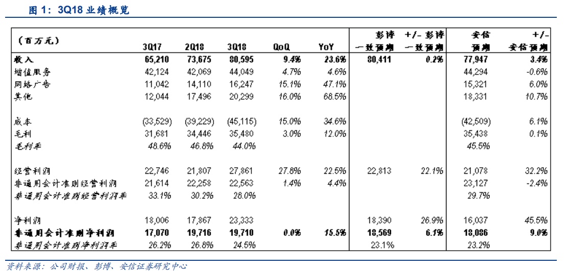 腾讯三季度总收入同比增长 24%至 806 亿元,符合彭博一致预期,比我们的预期高 3%。三季度非通用会计准则经营利润同比增加 4%至 226 亿元,对应经营利润率 28.0%,同比下滑 5.1 个百分点,主要由于毛利率下降以及高营销及研发费用;调整后净利润同比增加 15.5%至 197 亿元,比彭博一致预期高 6%,主要由于非经营项目,调整后净利润率为 24.5%,同比下滑 1.7 个百分点。