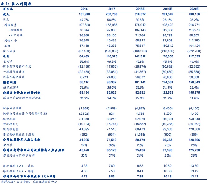 我们预期公司在 2018/19 年的收入同比增长分别为 31%/26%,其中增值服务收入同比增长14%/13%(手游总收入同比增长 24%/21%;端游同比增长-8%/-4%;非游戏增值服务同比增长 31%/18%);广告收入同比增长 45%/40%;其他收入同比增长 75%/46%。