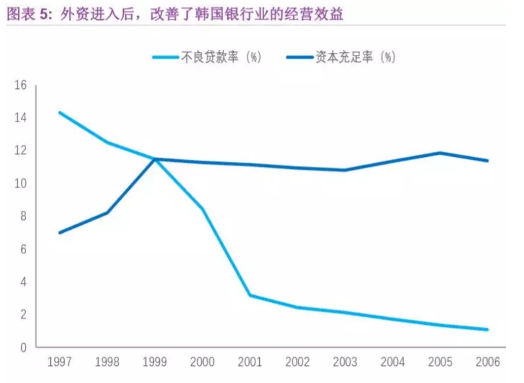 外资控股也改善了银行业的经营效益。通过资产重组和不良资产消化等方式,韩国银行业的不良贷款比例显著下降了。外资入股后,也引入了欧美等发达国家先进的管理经验和创新理念,这又给原先的银行造成了压力,迫使国内银行进行相应的整改,通过这样的竞争,韩国国内银行的效率得到提升。数据显示外资进入后,韩国银行的资本充足率在上升,而不良贷款率在下降,银行更加重视贷款的质量,整个银行业的风险得到了有效控制。