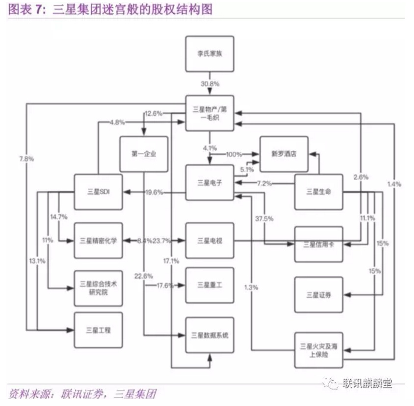 如三星集团的股权结构图所示,财阀集团的子公司之间往往互相出资,形成超级复杂的网状结构。在这样的股权架构下,财阀的子公司互相勾结,通过内部交易互相支撑,大大削弱了财阀企业的透明度。它也像一个蜘蛛网一般笼罩住韩国经济,使得韩国难以迸发出经济增长的新活力。