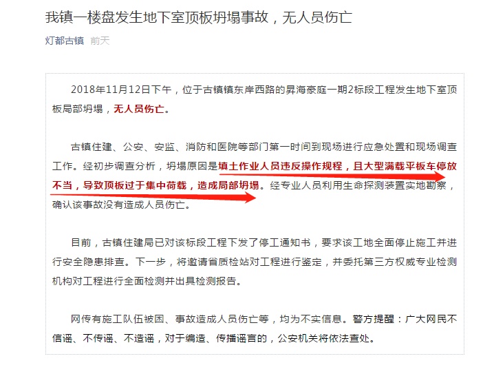 2018年11月12日下午,位于古镇镇东岸西路的昇海豪庭一期2标段工程发生地下室顶板局部坍塌,无人员伤亡。