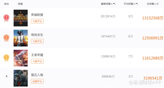 以下是国内主要直播平台在今年7-9月的分类频道人气排行榜数据。从排行榜中可以看到,目前虎牙平台在最高观看人气、平均观看人气及总观看人气数据上均未排上前列。智通财经APP深入观察发现,该3月,虎牙平台排名最前均为英雄联盟频道,其排名分别为第7位、第20位和第12位。