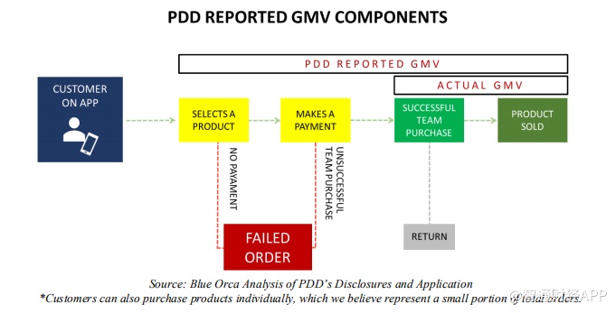 在实践中,Blue Orca认为拼多多报告的GMV中包括了数十亿个此类订单,要么是团购失败,要么是实际只留在了购物车当中。Blue Orca认为拼多多报告的GMV数据因此具有很高的误导性,较其电商同行报告的GMV不具可比性。这种独特的结构也解释了,拼多多报告的GMV,与其披露支付手续费和收入所暗示的实际GMV之间存在实质性差异。
