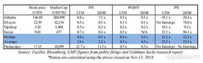 电商企业的价值不仅取决于收入和盈利能力,还取决于流量,主要是平台上的GMV。我们认为,多个数据点表明,拼多多报告的GMV显著虚高,想必是为了吸引投资者。