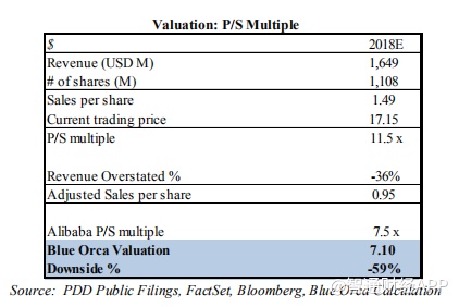 由于电商长期无利可图,因此投资者通常看重销售增速。我们认为,国家工商行政管理局(SAIC)文件提供了令人信服的证据,PDD 2017年的销售额比财报的低36%-40%。 因此,我们认为,按照销售额倍数对PDD进行估值时,应根据SAIC备案资料对其销售数据作相应调整。根据经调整后的销售数据,按照阿里巴巴7.5倍市销率的估值,我们估计PDD的股价为7.10美元,比当前价格低59%。